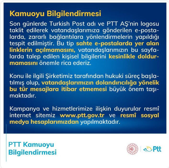 Son günlerde Turkish Post adı ve PTT AŞ’nin logosu taklit edilerek vatandaşlarımıza gönderilen e-postalarda, zararlı bağlantılara yönlendirmelerin yapıldığı tespit edilmiştir. Bu tip sahte e-postalarda yer alan linklerin açılmamasını, vatandaşlarımızın bu sayfalarda talep edilen kişisel bilgilerini kesinlikle doldurmamasını önemle rica ederiz.